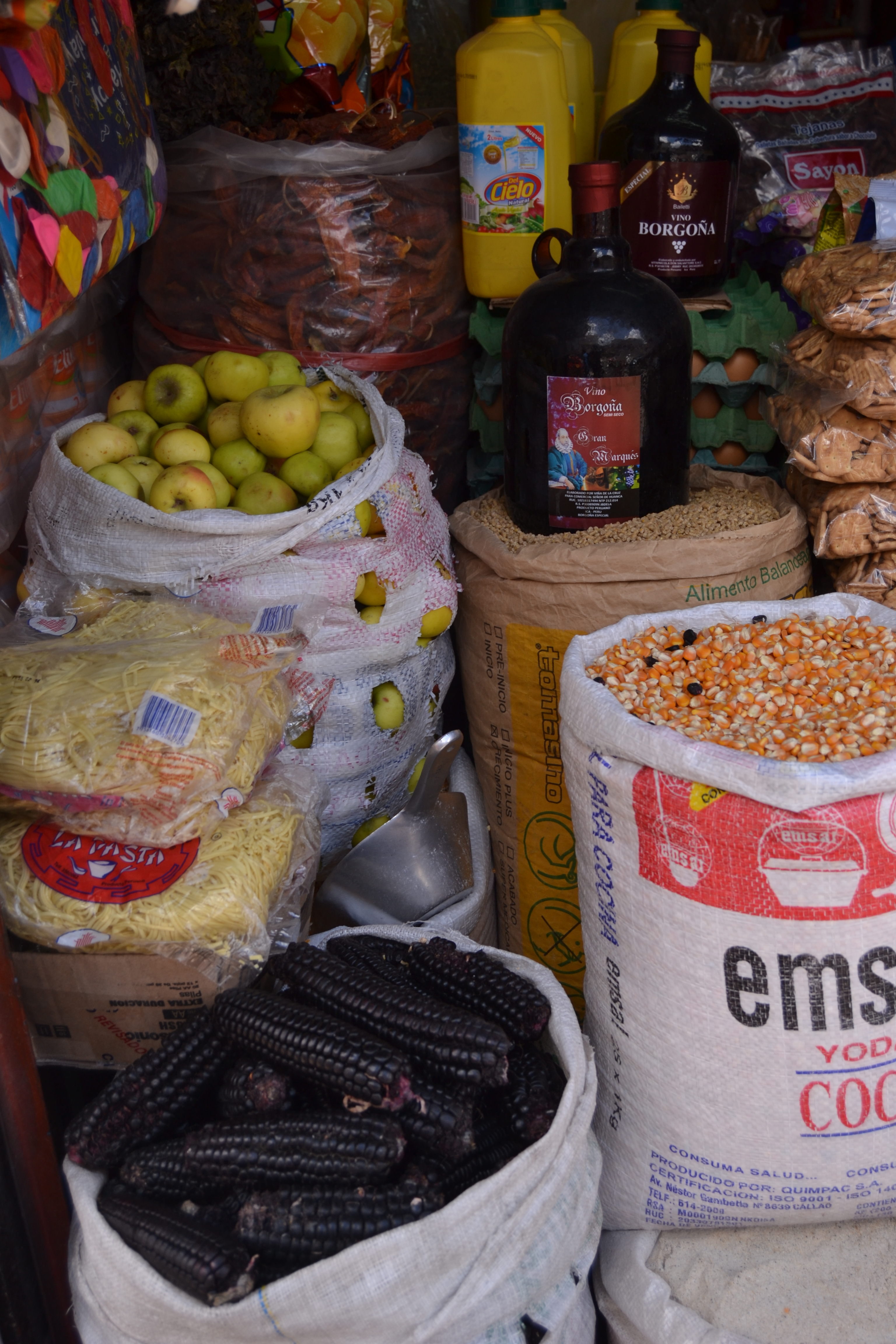 There is a bustle in the streets surrounding Mercado San Pedro, and an indifference to outsiders. Sacks of beans are piled to the top of doorways, chicken’s feet claw out of windows. The butcher hacks up a carcass to order on a slab right out on the street front. Andean ladies with dirty fingernails squat on corners selling fruit. One has a basket filled with whole roast guinea pigs, a delicacy in Peru. Honking cars burst from every side street and converge in the stalemate of a main road. Mangy dogs quietly thread between them. A policewoman blows a whistle, more in frustration, I think, than in hope of bringing order.
