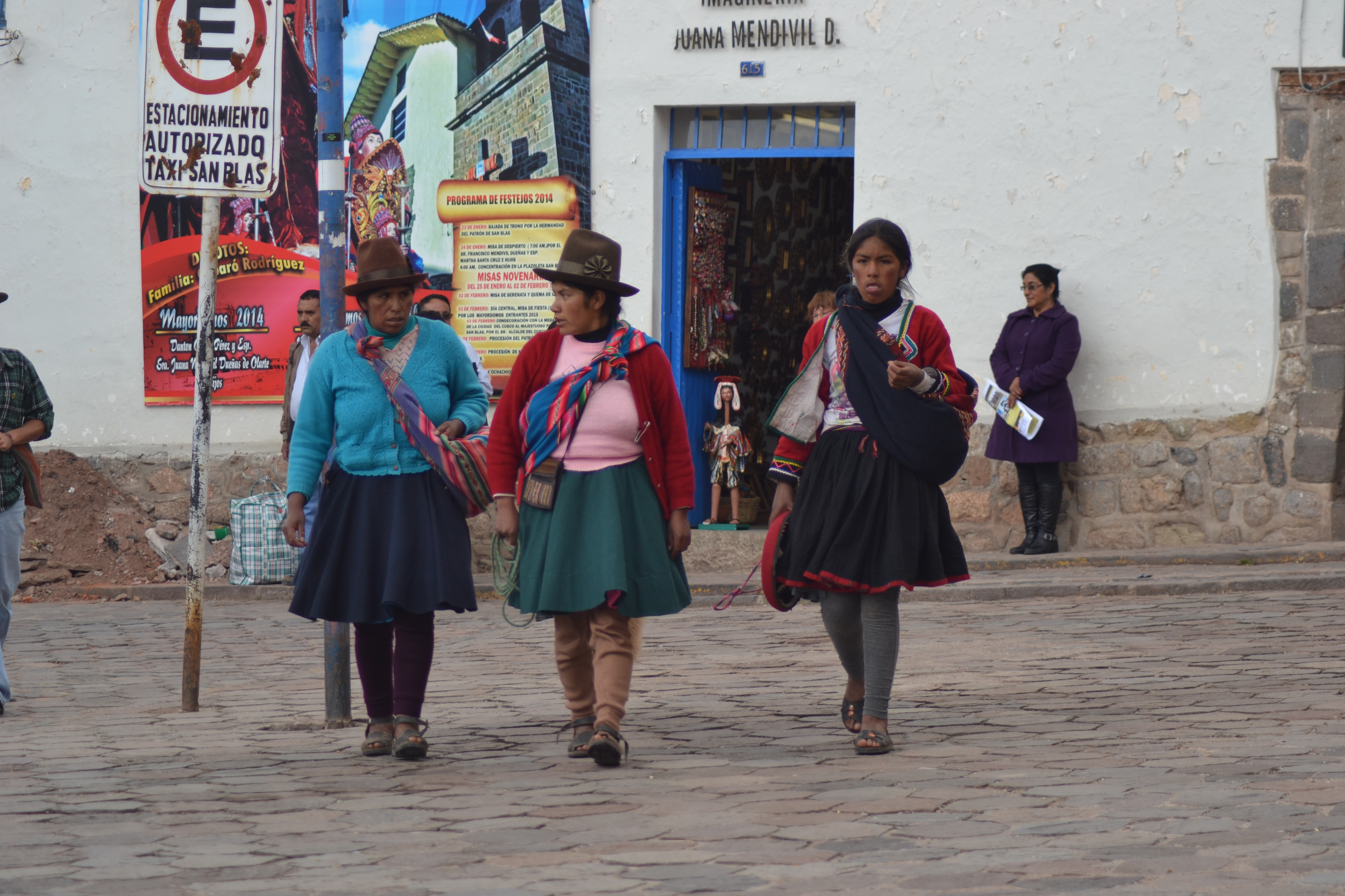 Cuzco was the Inca capital once, and it is an important centre for their modern descendants, the Quechua people. Ladies in fedora-like hats, voluminous skirts and Nora Batty stockings carry their babies in rainbow papooses and walk their llamas on leads. Some are there touting for business – “fotto, amigo, fotto please” – but most keep to themselves, huddle in the shade and chat.