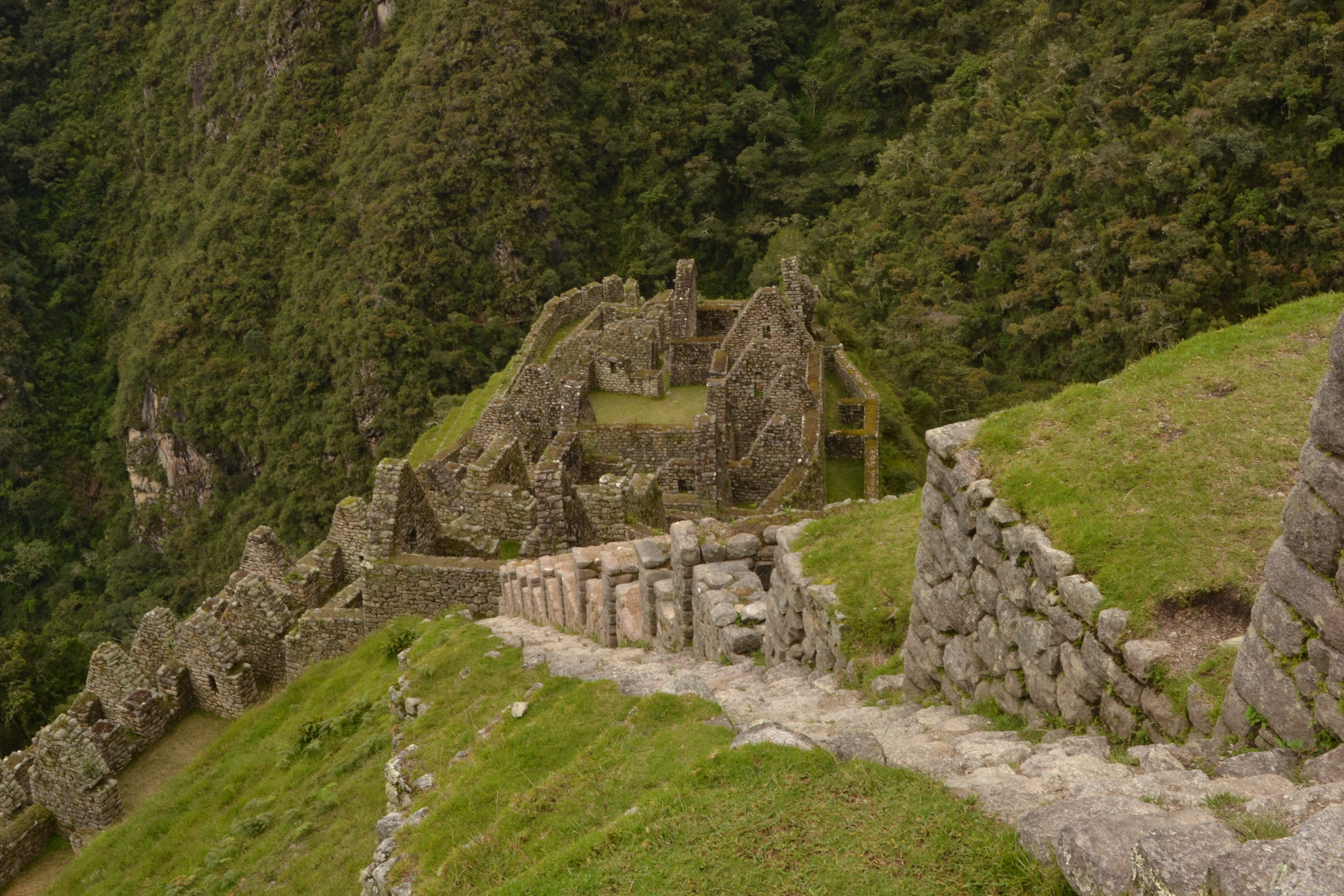 I went ahead again, and passed a hard-looking man who glared from a step, and I remembered something I had read in a guidebook about muggings along the trail. Three more men emerged from shelter when I climbed up the steps of Inti Punku, the last but one of the ruins on the trail. “Buen’ dias,” one growled and I looked back with relief to see Bepe and the others at the foot of the steps.
