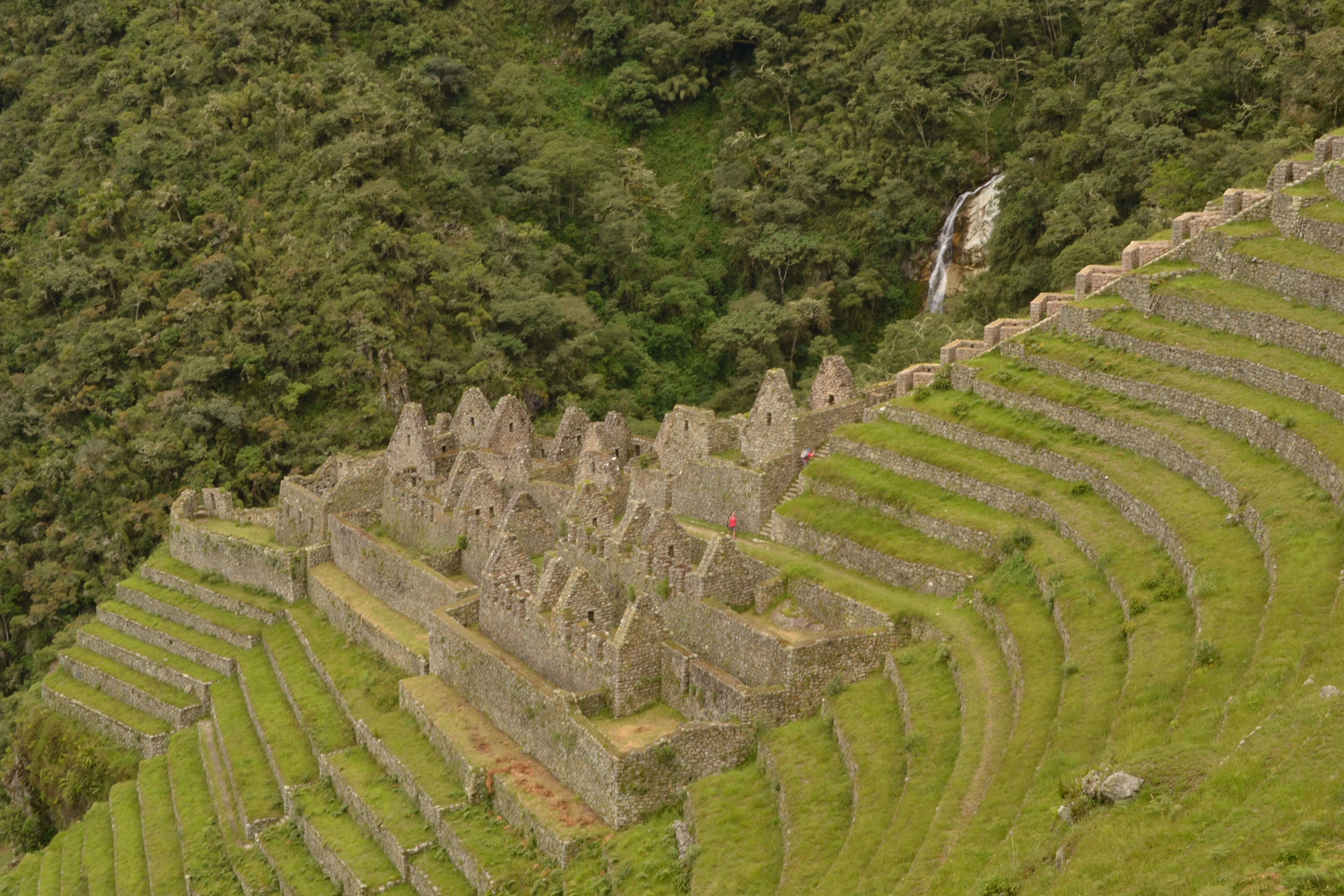 The trail led relentlessly upwards, snaked round the mountain, and continued upwards, until we had left the valley we started from way below and the river was but a scribble and the train track a toy shop display. We scrambled up Incan terraces, passed waterfalls which plunged gorgeously down the face of the rock, and looked across at the neighbour mountains carpeted with trees, and paused to contemplate flowers which erupted from the ledge in shocks of yellow and orange, and pink and red.