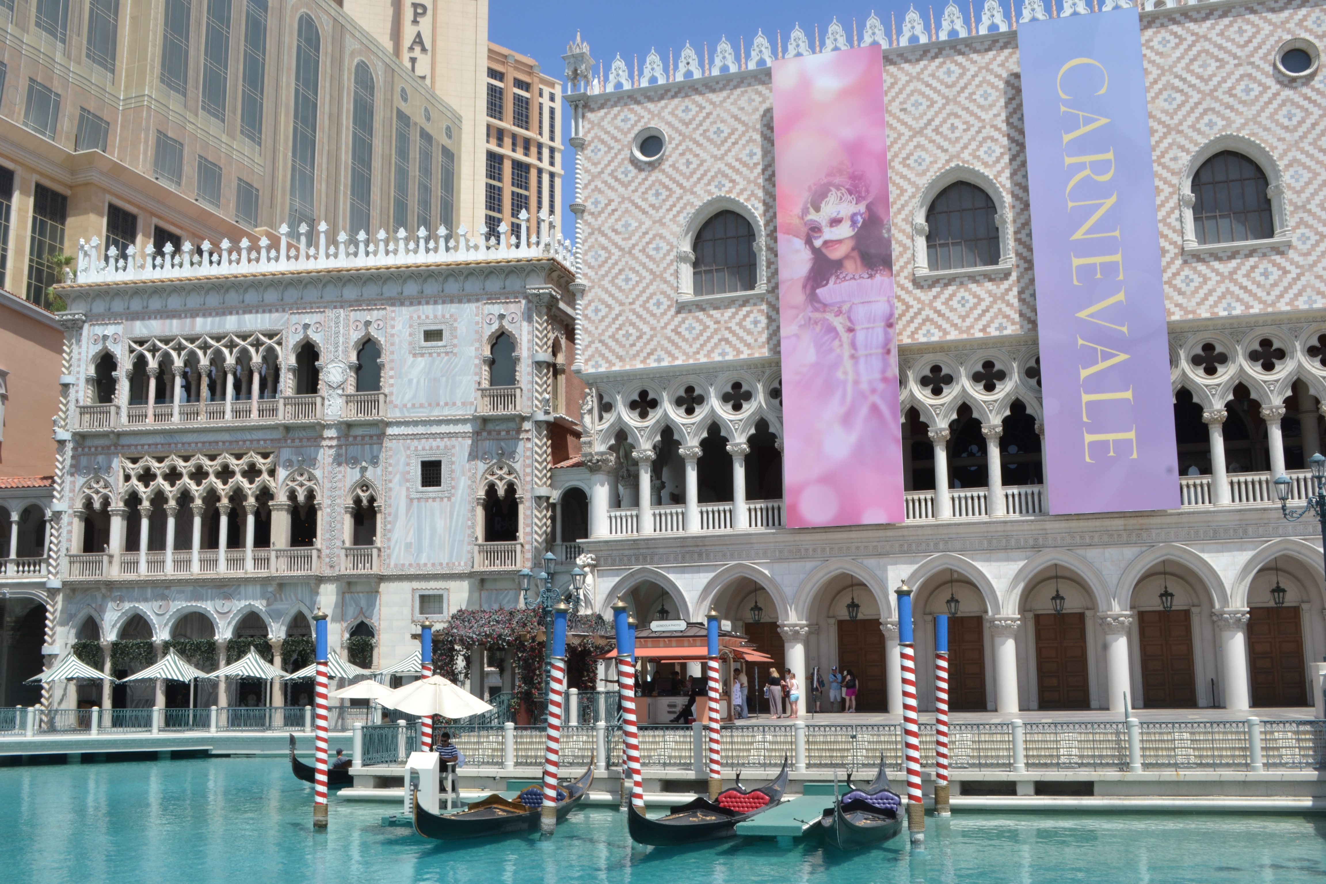 If you were as drunk as you were supposed, by tradition, to be in Vegas, you would never quite know whether you were inside or out, or what time of day it was. The shops and restaurants are behind facades which look like a street scene to continue the theme outside, and roofs are painted to look like the sky, and the lighting fools your brain into thinking it is perpetual evening. There are – famously – no clocks to contradict it.