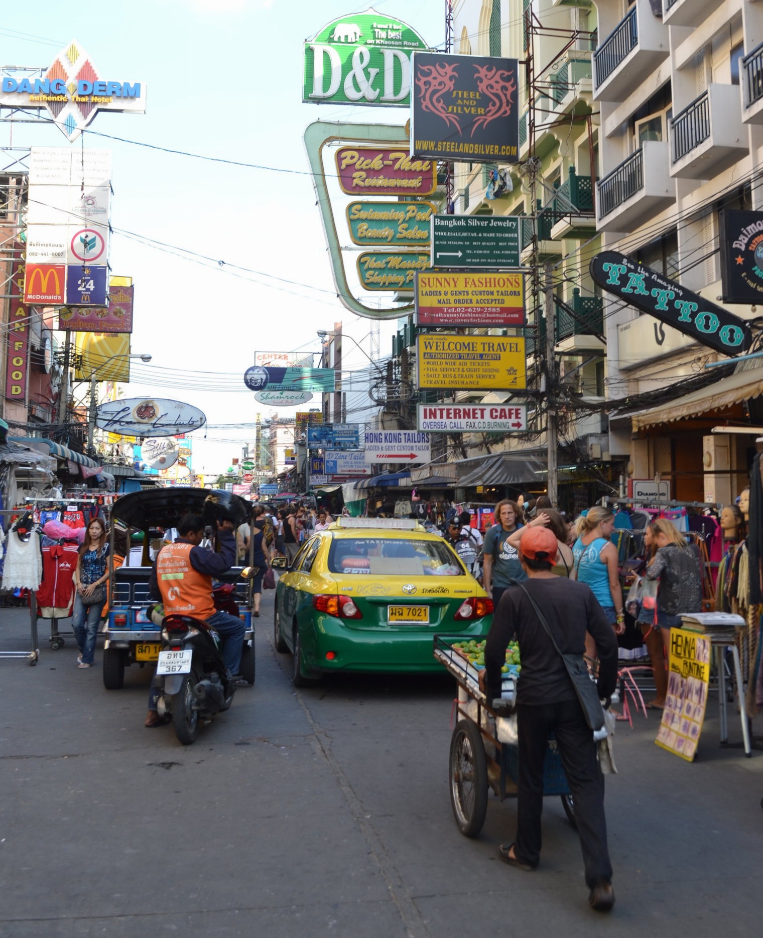 I waited to see if the crowds would thin out, but they swelled instead and I gave up on the idea of catching a bus and walked to the main road and flagged down a taxi. “Khao San Road?” I said, and he abruptly drove off by way of reply. The next two ignored me and drove past, and several after that already had fares, so I gave up on the idea of taking a taxi, as well.
