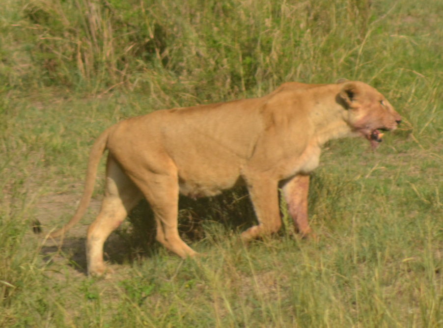 Just inside the park, there was a buffalo carcass, picked clean in the night, the best bits presumably eaten by lions, the rest polished off by vultures. There was a flock of them sitting in the trees around it, and a little further down the track, a coalition of lions. A lioness crossed the track right in front of the jeep; her fur was still stained with the blood of the buffalo. She walked with pugnacious purpose, as if on her way to argue with some petty bureaucrat.