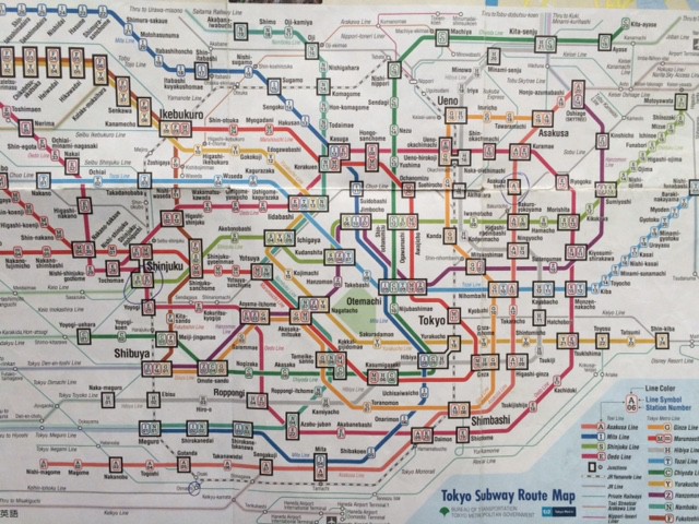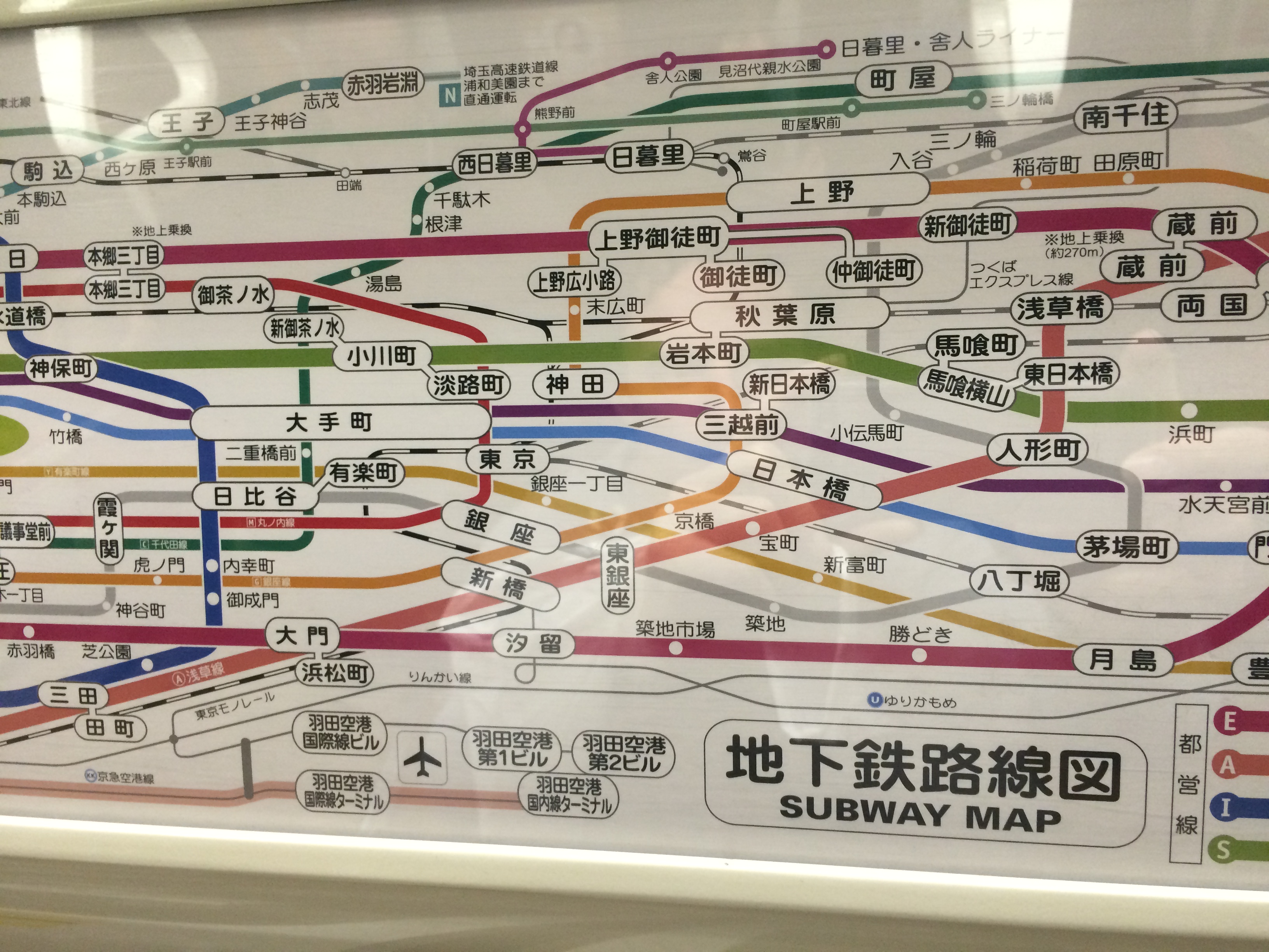 It might have been a wiring diagram for a Toyota Camry had it not been for the words “Subway Map” in the bottom right-hand corner. They were the only words in English: the station and line names were all in Japanese.